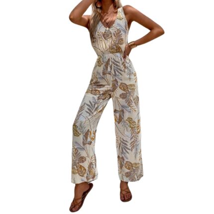 Jumpsuit Tropical con Cordón en la Espalda y Pierna Ancha