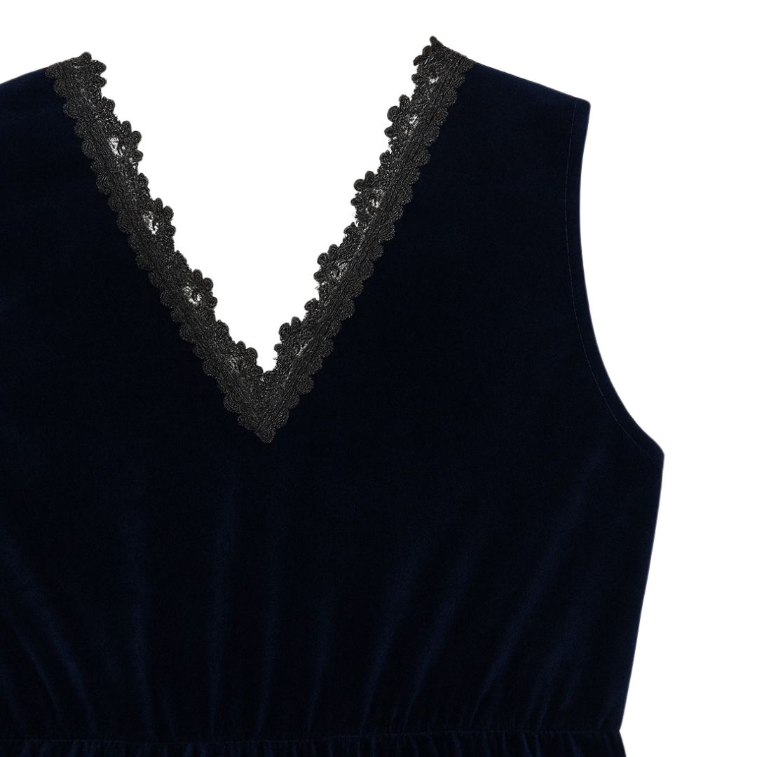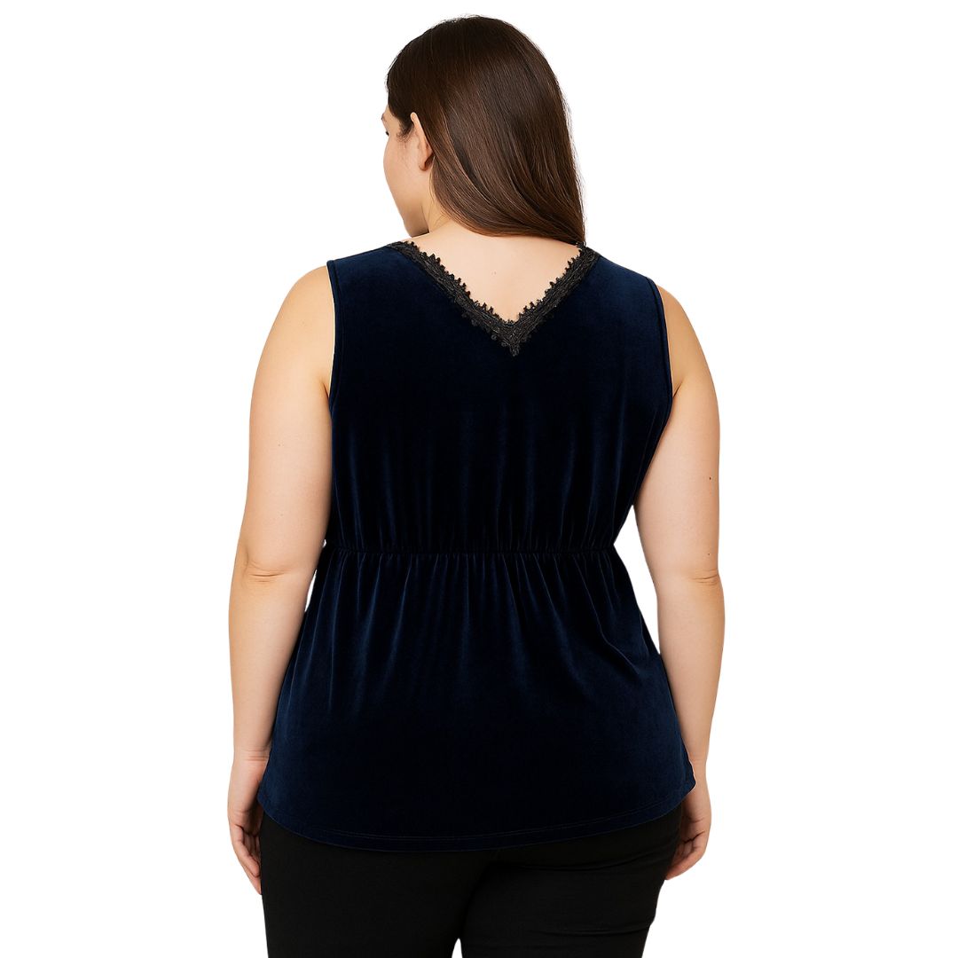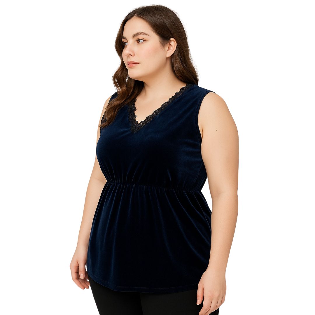 Esta elegante blusa sin mangas está confeccionada en suave terciopelo azul marino, ideal para lucir con estilo en ocasiones especiales o salidas nocturnas. Su escote en V está adornado con delicado encaje negro que aporta un toque romántico y femenino. El diseño entallado bajo el busto realza la figura y brinda comodidad al mismo tiempo. Perfecta para combinar con jeans o pantalones formales, esta prenda destaca por su textura lujosa y su calce favorecedor en talla plus.