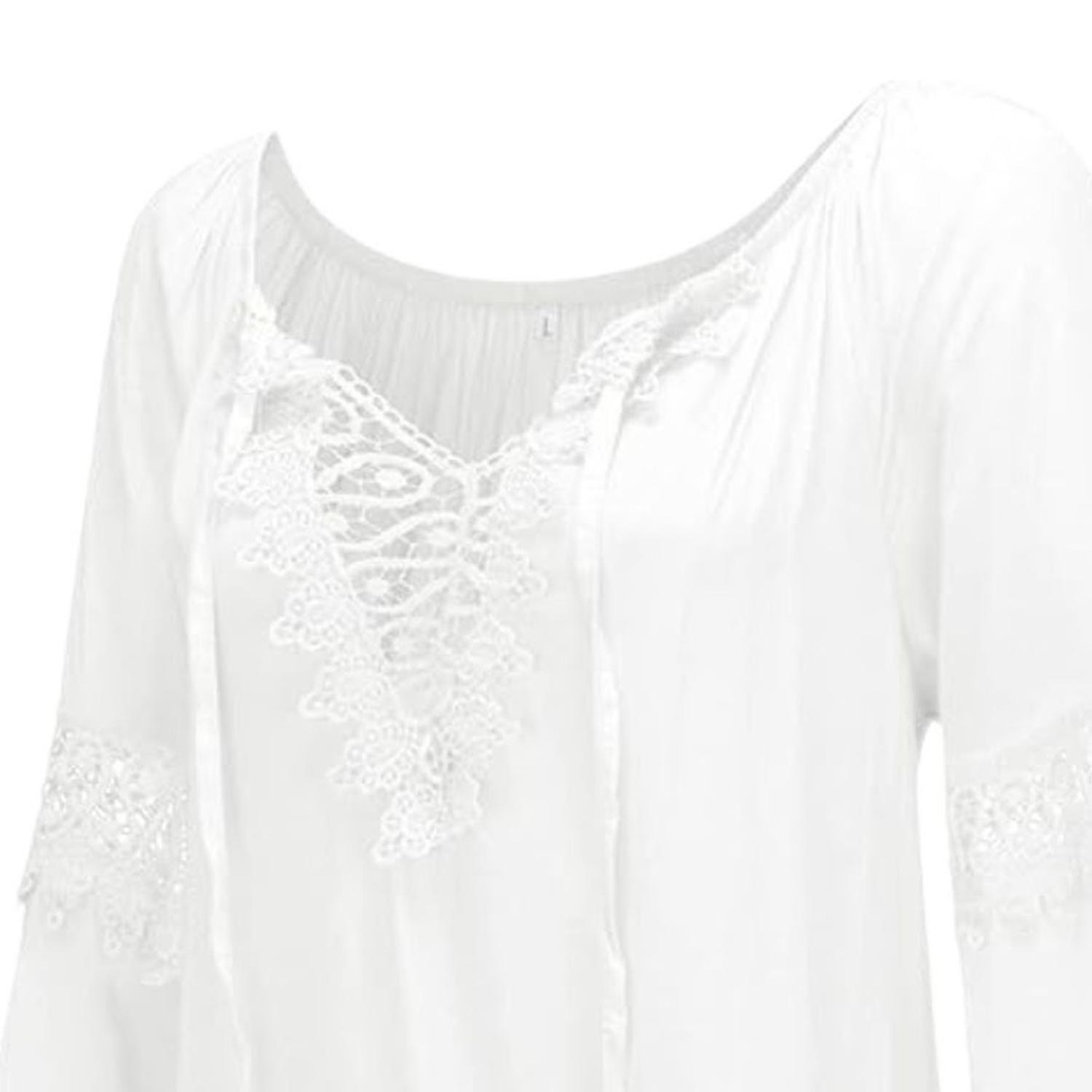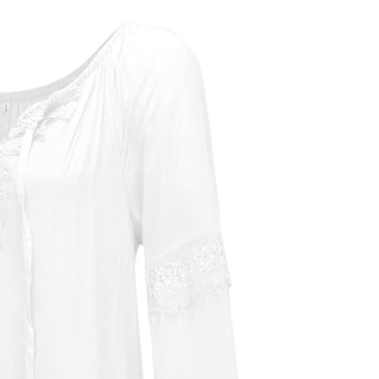 Blusa blanca con mangas largas en tela ligera, detalles de encaje en puños y escote con cordones. Estilo romántico y delicado. bh0GZARSZAD86125