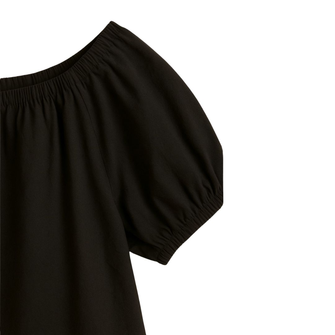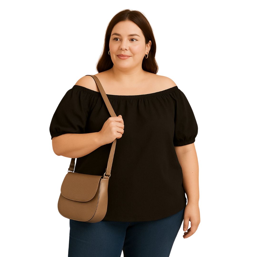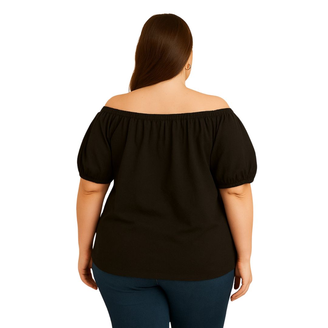 Blusa negra talla 4XL con hombros al descubierto y mangas globo. Fresca, moderna y con estilo femenino.