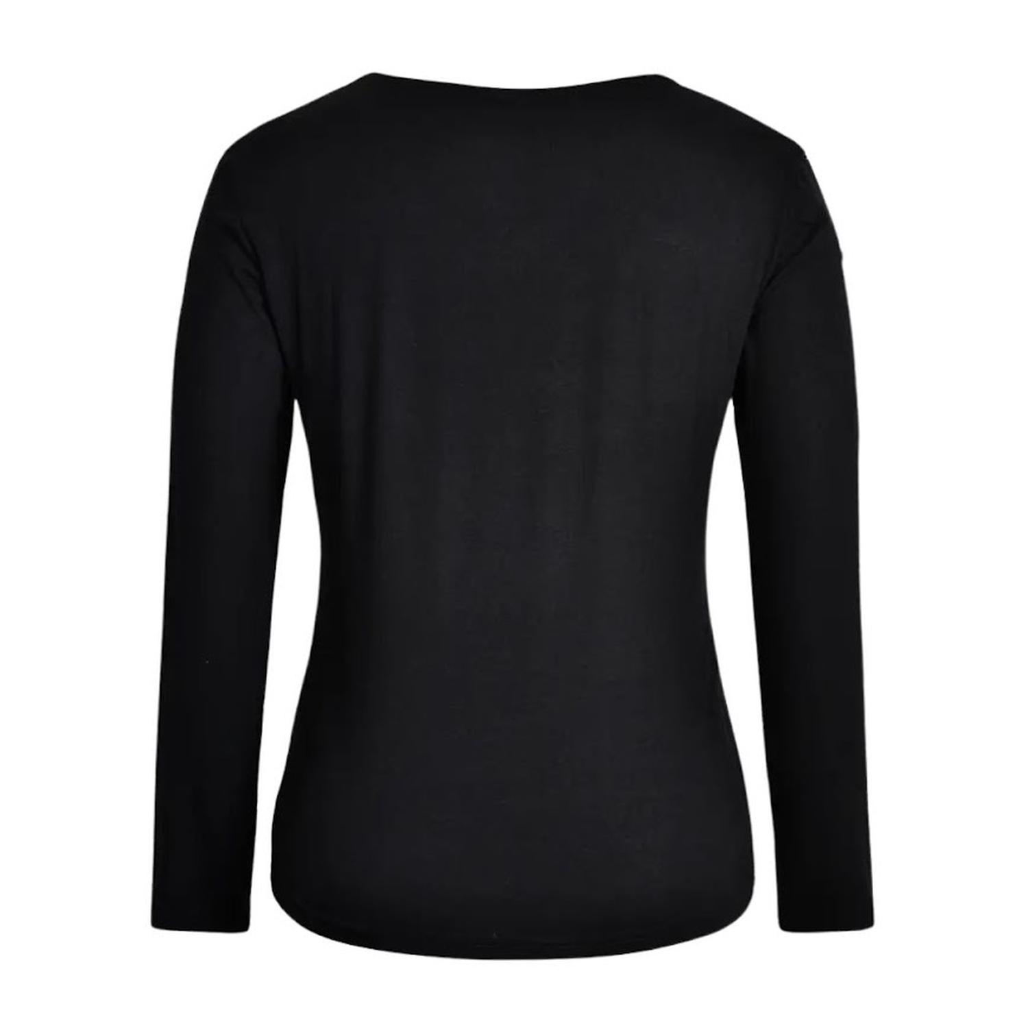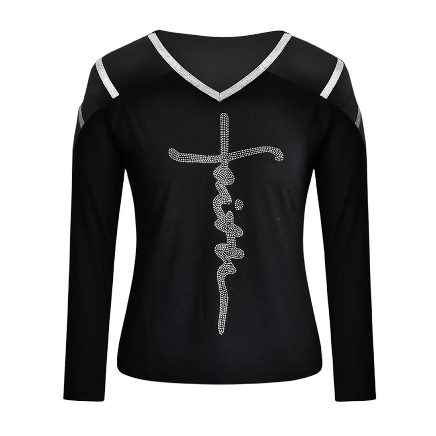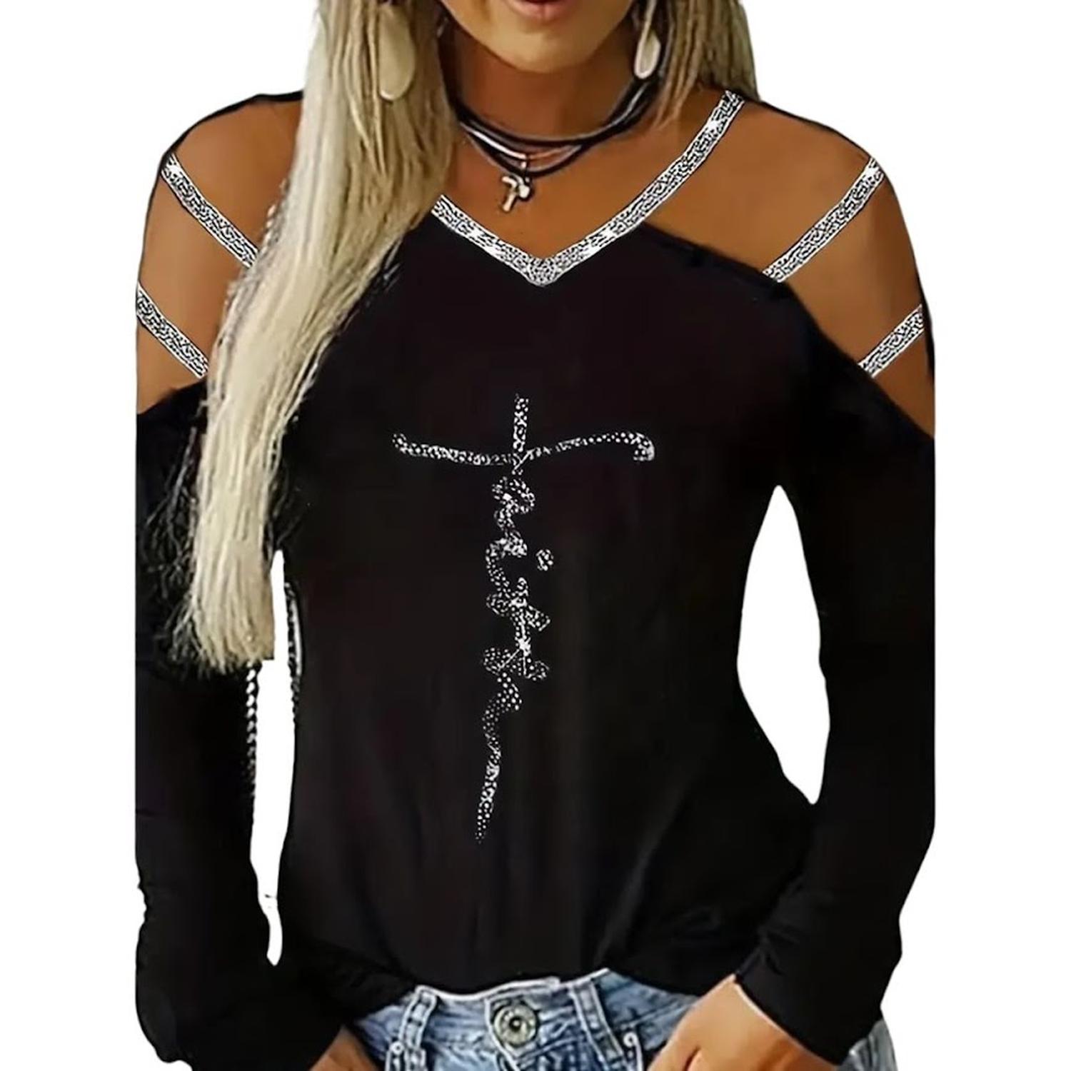 Camiseta negra de manga larga con hombros descubiertos, confeccionada en poliéster con 5% de elastano. Diseño con lentejuelas en contraste, escote en V, estampado geométrico, estilo casual, microelasticidad y tejido de ligero estiramiento. Ideal para entretiempo o primavera. ID:5654281