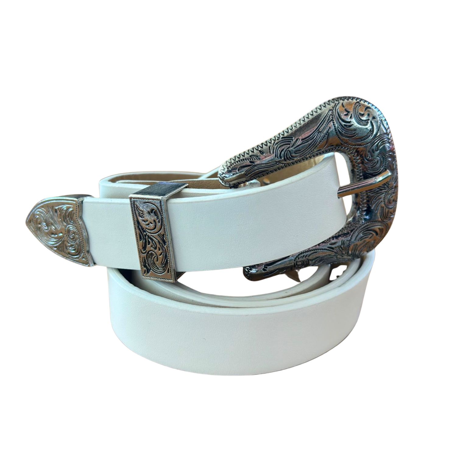 Luce un look único con este cinturón blanco texturizado. Hebilla metálica plateada con detalles grabados estilo western.