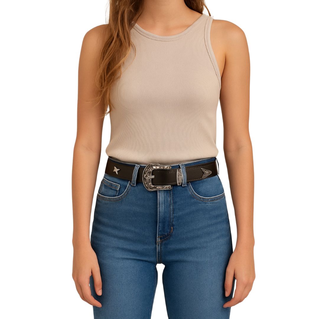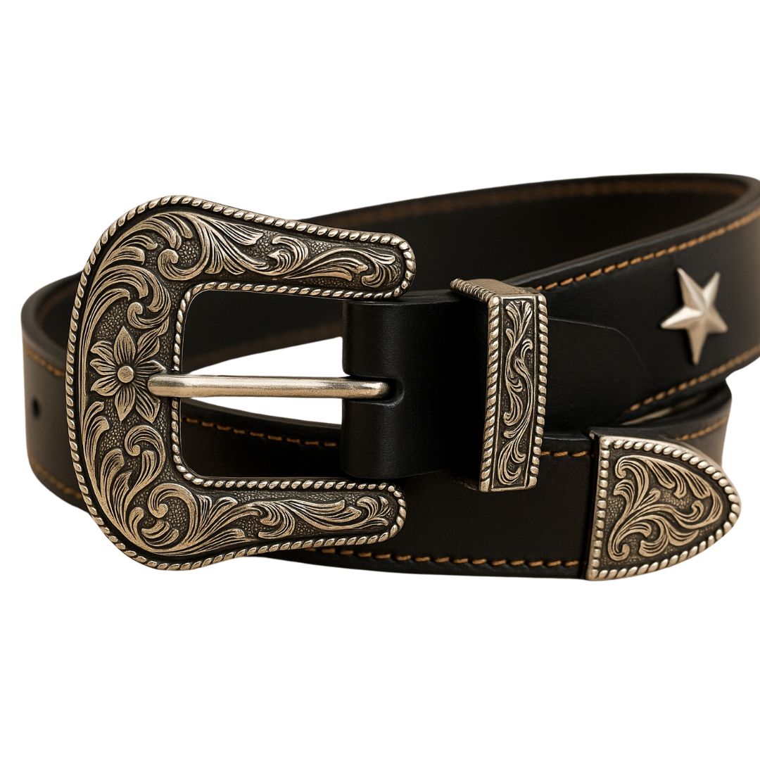 Cinturón con estrellas y hebilla metálica grabada