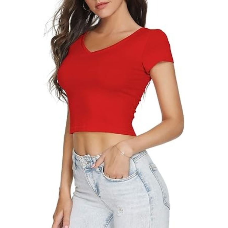 Esta camiseta básica de manga corta en color rojo es una prenda esencial para cualquier guardarropa. Con un corte ajustado y corto, aporta un toque casual y sexy a cualquier atuendo. Su suave mezcla de algodón y elastano proporciona comodidad y elasticidad para el uso diario.