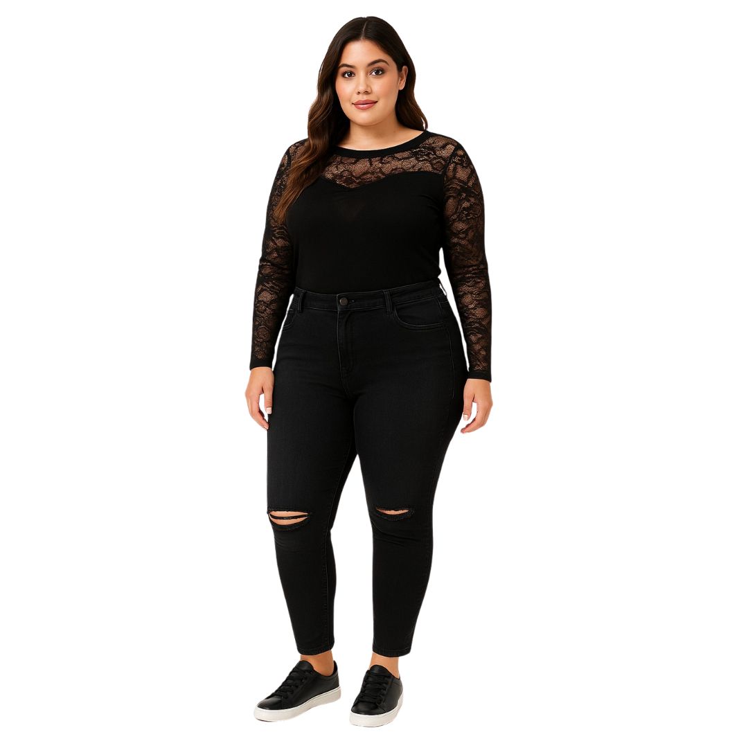 Jeans negro 3XL con efecto lavado y roturas en rodillas, calce ajustado y urbano.