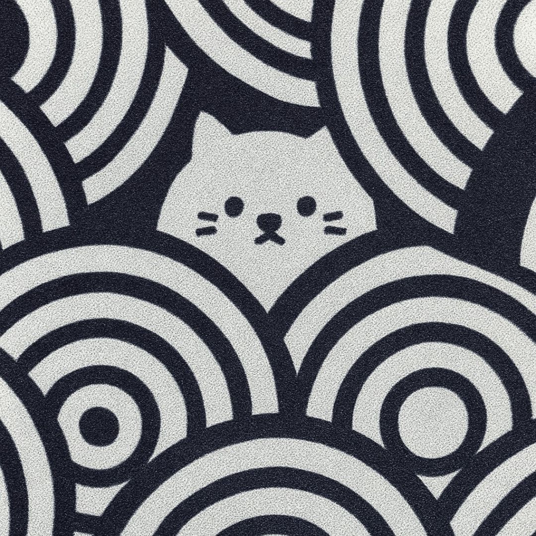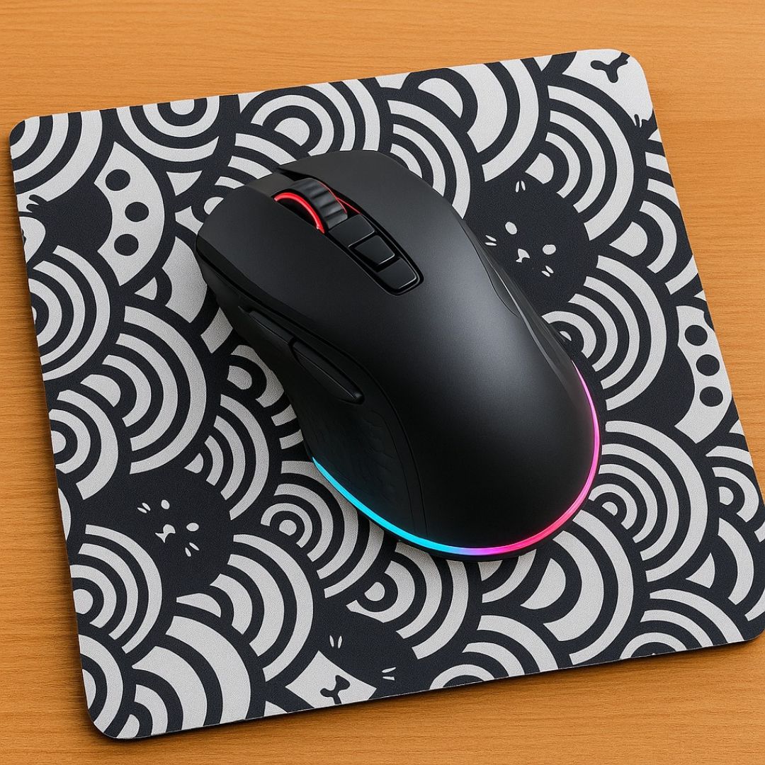 Pad mouse rectangular con diseño de gatos ocultos en patrón circular blanco y negro. Base antideslizante, cómodo y suave.