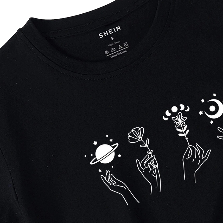 Polera casual con un diseño único de dibujos animados y figuras en color negro. Ideal para quienes buscan un look relajado y moderno.