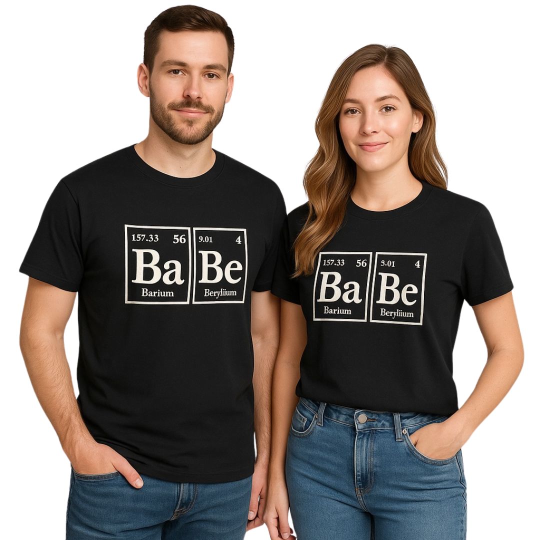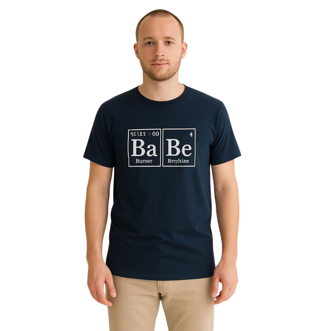 Camiseta negra con diseño divertido que combina los elementos químicos Bario (Ba) y Berilio (Be) en formato de tabla periódica. Ideal para quienes aman la ciencia y el estilo con personalidad. Confeccionada en algodón y poliéster según el color, con mangas cortas y ajuste cómodo.