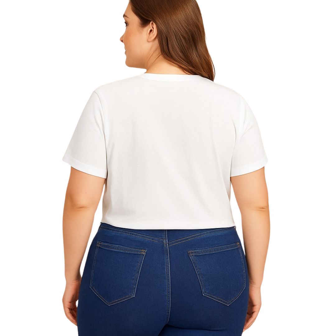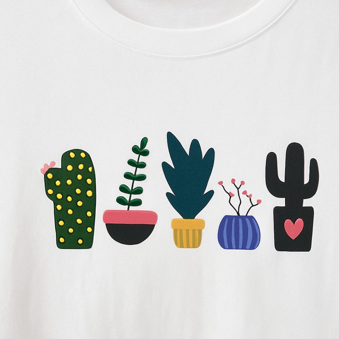 Polera blanca de algodón con diseño recto y cuello redondo. Estampado central de macetas con cactus y suculentas en estilo colorido y moderno. Ideal para looks casuales, relajados o urbanos.