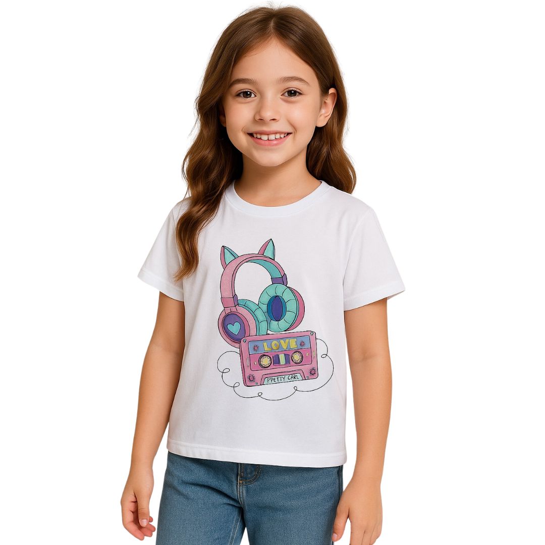 Polera Niña Blanca Diseño Cassette y Audífonos Kawaii