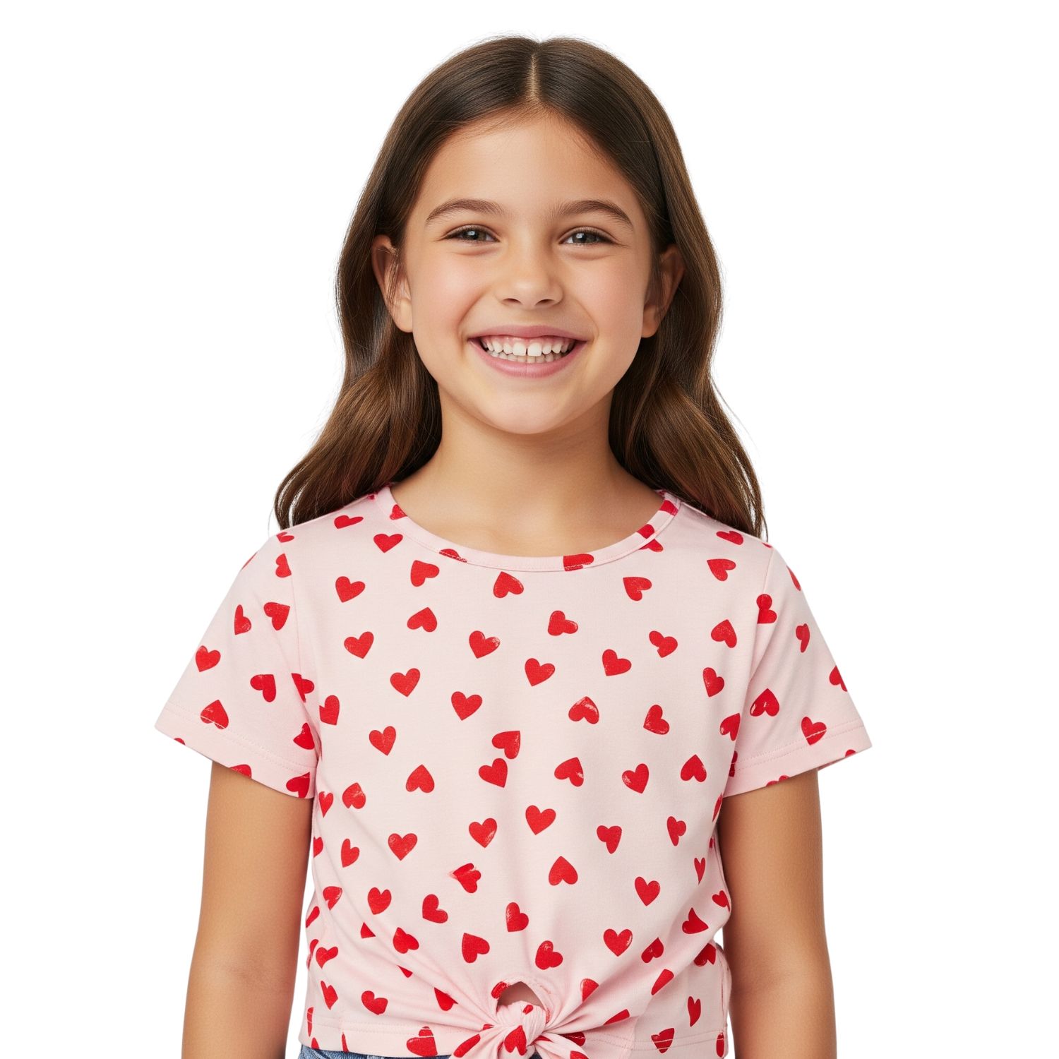 Polera rosa niña con corazones y amarre delantero. Polera de niña color rosa claro con estampado de corazones rojos y amarre en la parte delantera. Ideal para días cálidos por su diseño fresco y cómodo.