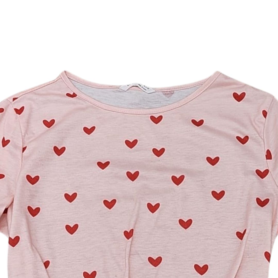 Polera rosa niña con corazones y amarre delantero. Estampado corazones rojos. Diseño fresco y cómodo. Talla: 9Y.