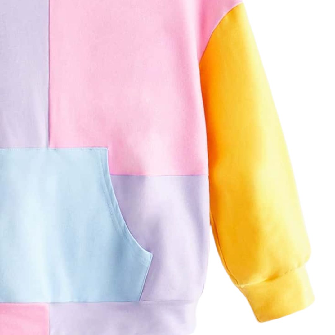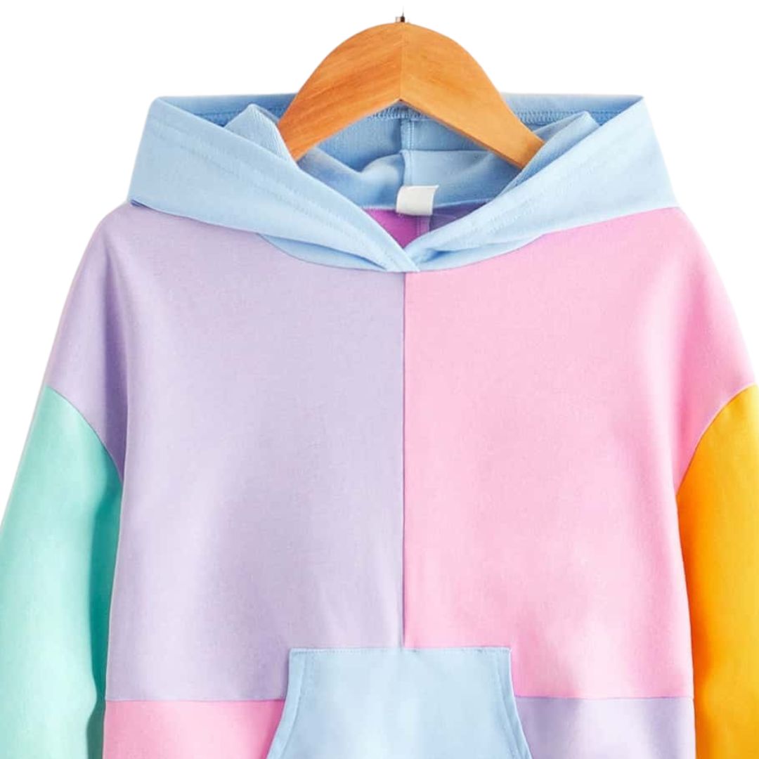 Polerón infantil de diseño color block pastel, con capucha y bolsillo delantero tipo canguro. Combinación de colores lila, rosado, celeste, amarillo y verde menta, ideal para primavera u otoño. Hecho con tela suave y confortable. 6340942