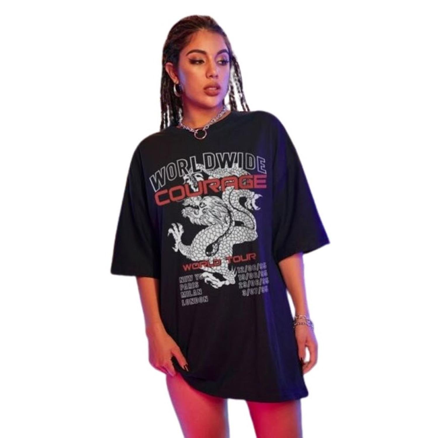 Remera oversize negra con diseño gráfico «WORLDWIDE COURAGE» y dragón en el centro. Estilo urbano, ideal para un look moderno y llamativo. swtee23210526782