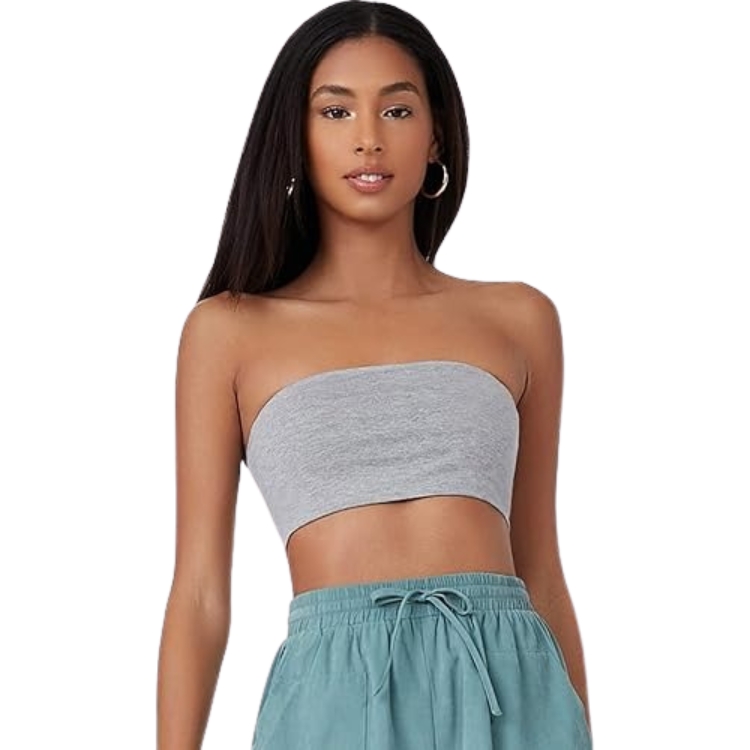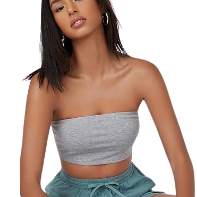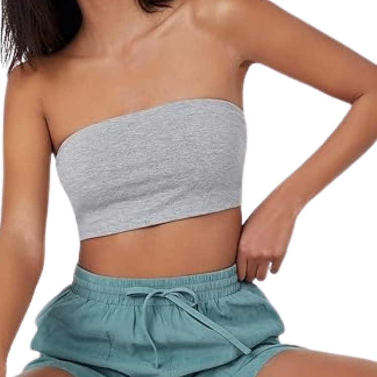 Un top bandeau sin tirantes en un elegante gris claro, ideal para destacar un look sexy y minimalista. Perfecto para combinar con prendas de cintura alta y crear un estilo moderno y fresco.