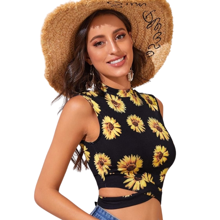 Este top corto de estilo bohemio cuenta con un vibrante estampado floral de girasoles que aporta un aire fresco y natural a cualquier look. Con un diseño cruzado y un cuello alto, esta prenda es ideal para añadir un toque chic y juvenil. Confeccionado en un tejido ligeramente elástico para un ajuste cómodo y favorecedor, es perfecto para combinar con tus prendas favoritas de verano.