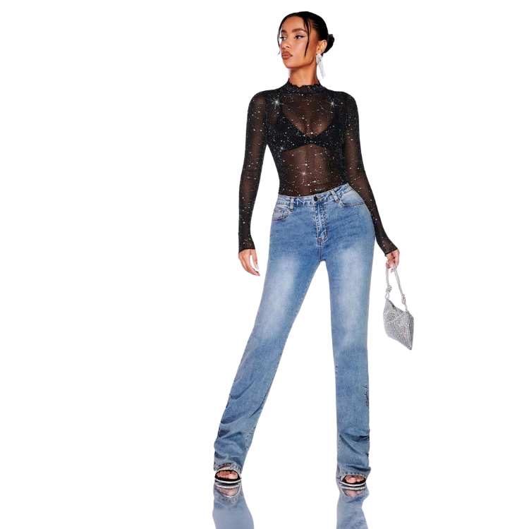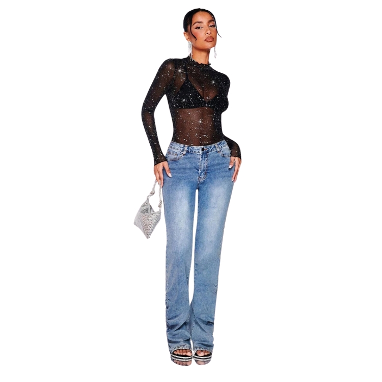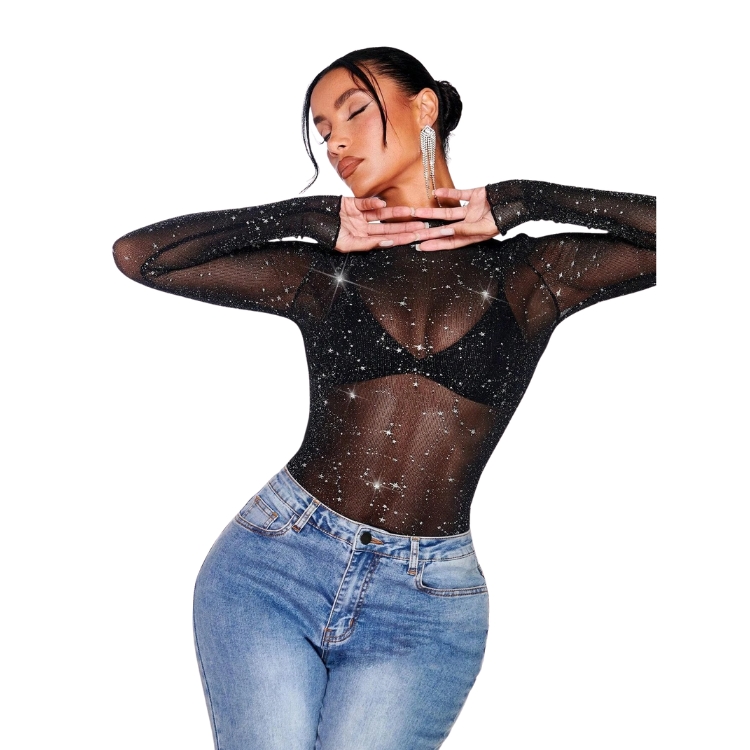 Este top de malla negra con purpurina y diseño de borde en forma de lechuga es la prenda ideal para un estilo sexy y atrevido. Su estampado tipo galaxia aporta un toque único y su tejido de alto estiramiento garantiza comodidad y un ajuste ceñido al cuerpo. Perfecto para una salida nocturna o un look de fiesta. La transparencia de la malla permite crear combinaciones únicas y destaca el detalle de purpurina, ideal para brillar en cada ocasión.
