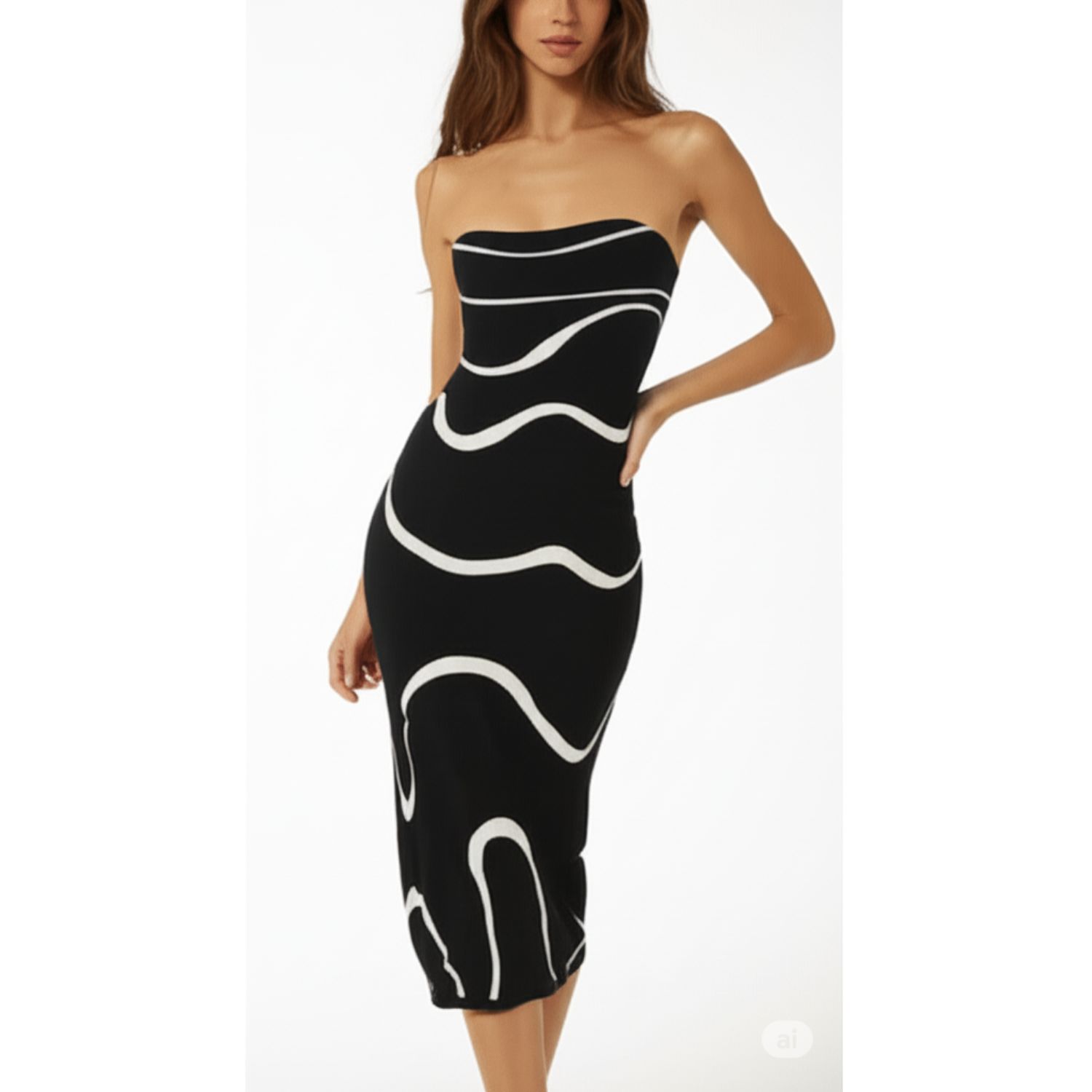Moderno vestido negro con un audaz diseño de rayas blancas diagonales. Top elásticado para un ajuste cómodo y versátil.
